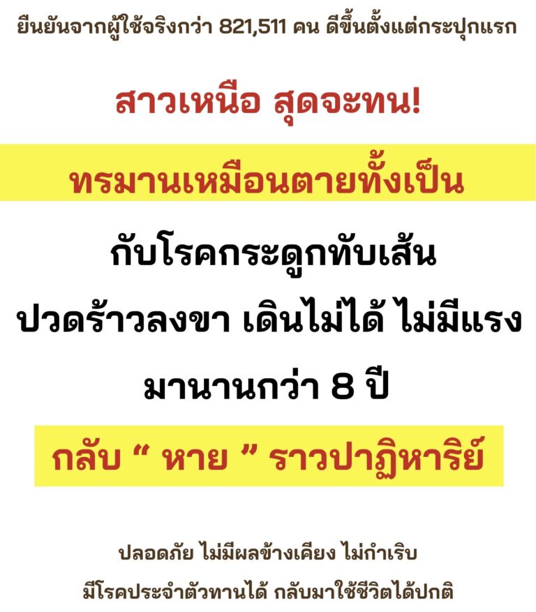 สวัสดีคะ ชื่อ สาว น่ะคะ อายุ 48 ปี เป็นคนแพร่คะ วันนี้เราอยากจะมาแชร์ประสบการณ์ของตัวเอง เล่าย้อนกลับไปเมื่อ 8 ปีที่แล้วคะ เราเคยป่วยเป็นโรคกระดูกทับเส้น แต่ตอนนี้หายเป็นปกติแล้ว เรามีอาการ ปวดหลัง ปวดเอว ปวดสะโพก ปวดร้าวลงขา น่อง เป็นเหน็บและชาตามมือตามเท้า กล้ามเนื้ออ่อนแรง สูญเสียการทรงตัว เดินเซ ควบคุมการขับถ่ายไม่ได้ ซื้อยามาทานก็ไม่ดีขึ้น
